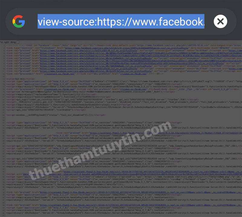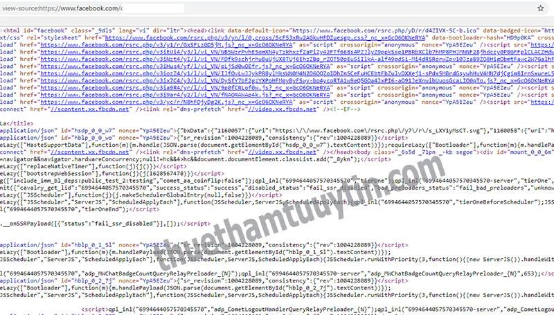 Bước 4: Bạn đang ở trong trang facebook cá nhân của mình, lúc này trên thanh địa chỉ của trình duyệt bạn hãy chèn thêm dòng chữ view-source: ở đằng trước địa chỉ https://facebook sau đó nhấn ok hoặc enter để nó hiện ra đoạn code nhì nhằng, hình dưới đây cho bạn thấy rõ hơn về bước này nhé.
