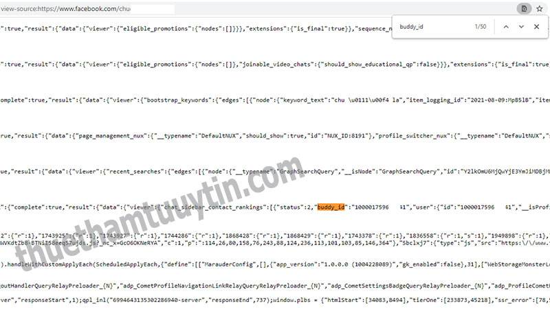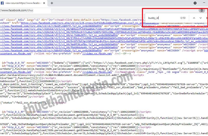 Bước 6: Đến bước này nó sẽ hiện ra ô tìm kiếm ở đầu bạn hãy nhập chữ buddy_id sau đó ấn vào mũi tên lên xuống ở phía góc phải lúc này nó sẽ hiện ra chữ buddy_id nền màu vàng và bạn sẽ thấy có dãy số 10000xxxxxxxxx , dãy số này chính là nơi để soi ra xem ai vào tường facebook của mình nhiều nhất.