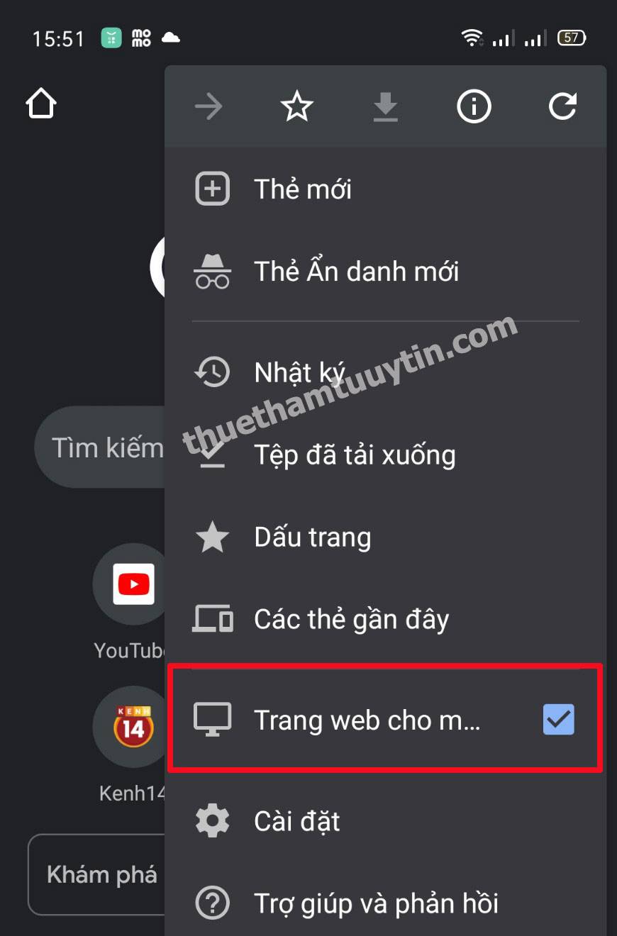 Bước 1: Mở điện thoại và bật trình duyệt chrome lên (Bạn có thể sử dụng trình duyệt khác nhưng mình chỉ hướng dẫn trên trình duyệt chrome thôi), ở góc phải của trình duyệt bạn thấy có ba chấm và bạn click vào biểu tượng ba chấm, sau đó trỏ ra một loạt thẻ và bạn tích vào Trang web cho máy tính.