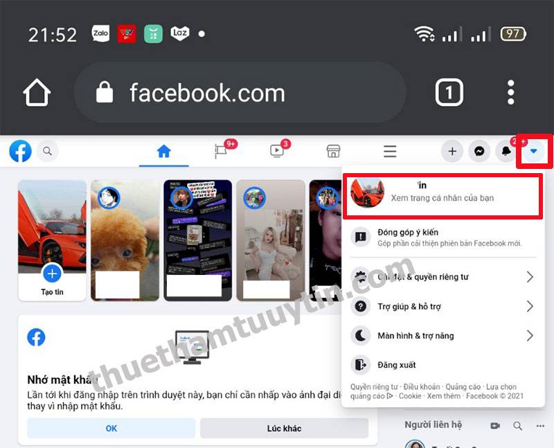 Bước 3: Bạn sẽ vào trang cá nhân của mình bằng cách chọn dấu mũi tên xuống ở góc phải màn hình sau đó nhấn vào ảnh hoặc tên face của bạn để đi đến trang cá nhân. Nếu bạn không rõ bước này hãy nhìn hình ảnh dưới đây được bao bởi viền đỏ.