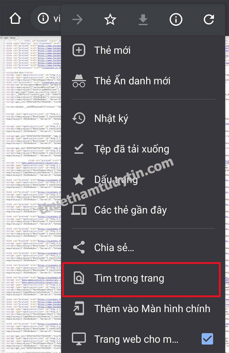Bước 5: Lúc này mã nguồn trang cá nhân bạn đã được bật lên và bạn không cần phải quan tâm đến những đoạn code rối mắt này. Bây giờ bạn hãy nhấn vào dấu ba chấm ở góc phải của trình duyệt web và nó trỏ ra các thẻ mới và bạn chọn đến thẻ Tìm trong trang được bo viền đỏ bằng hình ảnh dưới đây.