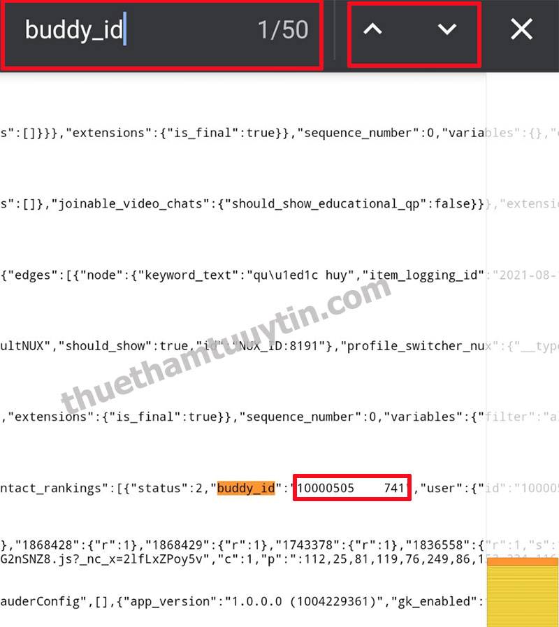 Bước 3: Sau khi gõ chữ buddy_id vào khung tìm kiếm xong bạn nhấn Enter nó sẽ hiện ra dòng có chữ buddy_id bôi đậm và có dãy số bên cạnh 10000xxxxxxxxxx như hình dưới đây.