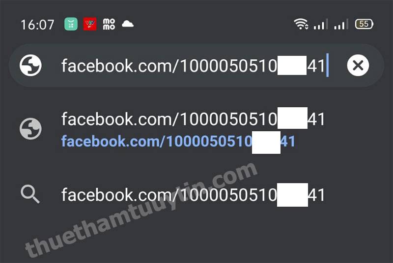 Bước 7: Bạn copy dãy số 10000xxxxxx và mở một thẻ trình duyệt mới sau đó nhập vào thanh địa chỉ web với cú pháp như sau https://facebook.com/10000xxxxxxx sau đó nhấn ok, nếu bạn không hiểu hãy xem hình dưới đây.