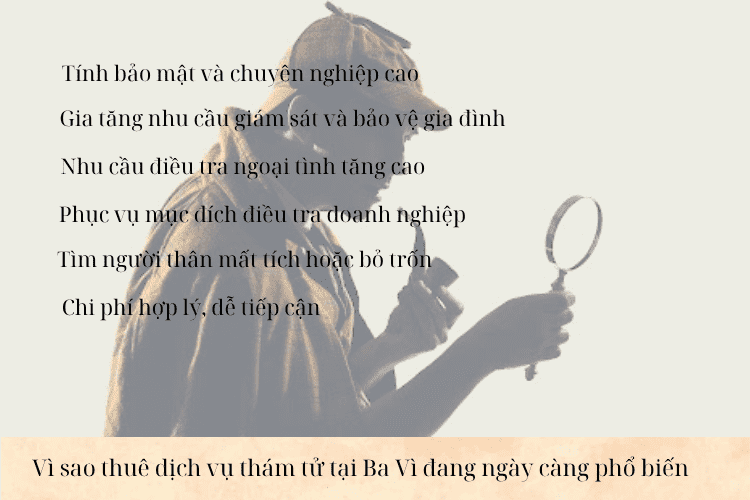 Thuê dịch vụ thám tử ở Ba Vì đang ngày càng phổ biến vì nhiều lý do thực tiễn và xã hội. Dưới đây là những nguyên nhân chính lý giải xu hướng này: