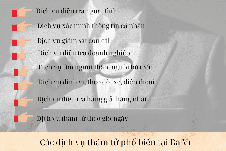 Dưới đây là các dịch vụ thám tử phổ biến tại Ba Vì đang được nhiều khách hàng cá nhân và doanh nghiệp tin tưởng sử dụng: