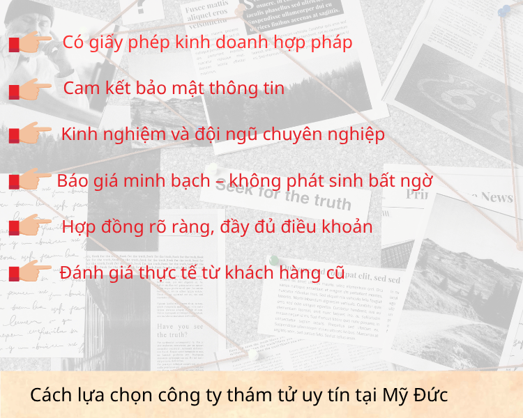 Kinh nghiệm và đội ngũ chuyên nghiệp: Ưu tiên đơn vị đã hoạt động từ 5 năm trở lên, có kinh nghiệm thực tế. Có đội ngũ thám tử am hiểu địa bàn Mỹ Đức, xử lý tình huống linh hoạt.